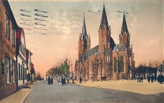 Bilder: links oben um 1940, rechts 1895, unten ca. 1900. Die Konstruktion der Martinskirche basiert auf der Symbolik von Zahlen, die im christlichen Glauben eine tiefere Bedeutung haben. So sind die Türme auf quadratischem Grundriss errichtet. Das Quadrat deutet hin auf die vier Himmelsrichtungen. Dieser Grundriss verleiht den Türmen Festigkeit und Fundament. Wie ein Bollwerk sichert der Hauptturm die Kirche zum Westen hin.