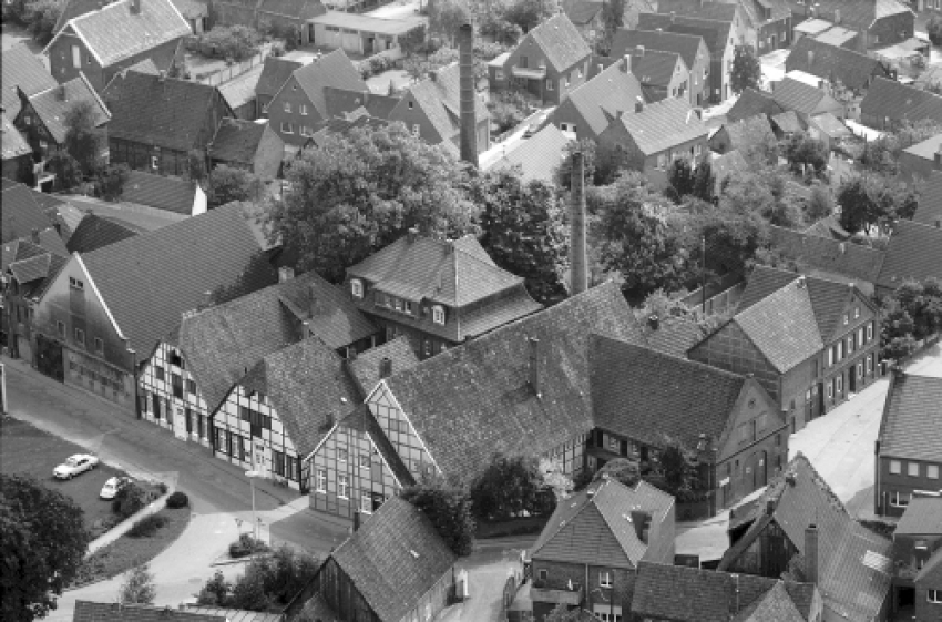 Bild rechts: Luftaufnahme, Ende der 1960er Jahre, „Eingang“ zur heutigen Fußgängerzone (Einweihung 1988) mit den Brennereien Graute und Schulze Rötering (Gaßner) Das Ensemble mit den Fachwerkhäusern Graute,
