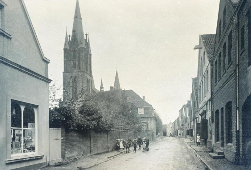 In dem 1981 im Rahmen der Stadtsanierung abgebrochenen Wohn- und Geschäftshaus des Anton Möllers befand sich eine Schuhmacherwerkstatt mit Laden. Links auf dem Foto, das etwa 1935 aufgenommen wurde, ist der Schuhmachermeister Möllers zu sehen.