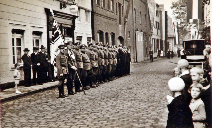 Bild: 1930er – Stahlhelm tritt auf der Weststraße an.