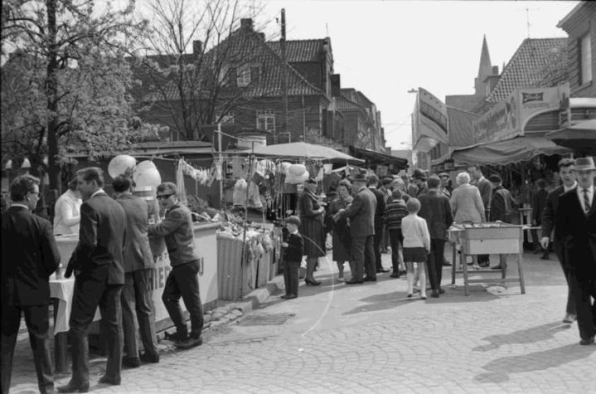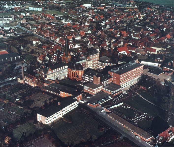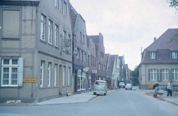 Bild rechts: Luftaufnahme, Ende der 1960er Jahre, „Eingang“ zur heutigen Fußgängerzone (Einweihung 1988) mit den Brennereien Graute und Schulze Rötering (Gaßner) Das Ensemble mit den Fachwerkhäusern Graute,