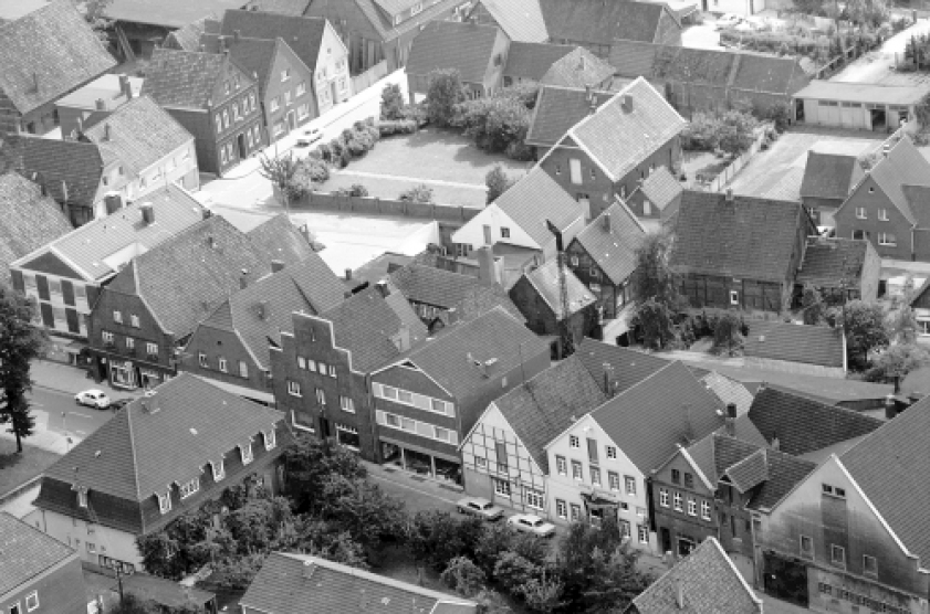 Bild: Luftaufnahme Kirchstraße / Weststraße Ende der 1960er Jahre: von links Volksbank, Plüschke, Brandhove, Mössing, Hölscher, Kaupmann (2 Gebäude), Melker Schulze Rötering, Wirtschaftsgebäude Schulze Rötering